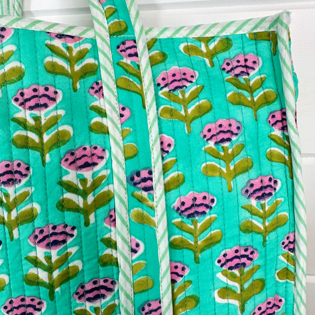 Aqua Floral Print Oversized Quilted Tote Bag: Featuring a vivid aqua backdrop layered with whimsical floral handprinted designs, this oversized tote brings cheerful color and artisan charm to every outing. Each bag is quilted from 100% cotton, making it both lightweight and sturdy, while the reversible design adds a second stylish look for your customers to enjoy. Handcrafted by skilled artisans in India, every piece is made in small batches using traditional hand-printing techniques. Features & Details: • Oversized quilted tote bag (17.5" x 17.5") • Reversible design with contrasting interior fabric • Interior pocket for convenient storage • Constructed with 100% cotton, quilted hand printed fabric • Lightweight yet sturdy, perfect for everyday use • Handmade in small batches using traditional artisan techniques • Sustainably and ethically produced Perfect Uses: • Market tote for everyday errands • Beach bag with plenty of room for towels and sunscreen • Travel or weekender bag for quick getaways • Oversized shopping tote for boutique or farmers’ market finds • Overnight bag or carry-on for stylish travelers • Giftable tote for birthdays, holidays, or boutique displays Perfect for: market tote, beach tote bag, weekender bag, overnight bag, large shopping tote, travel bag & more!