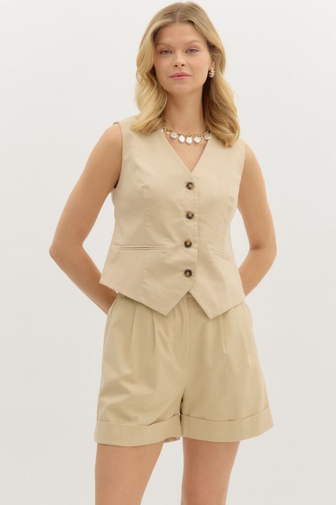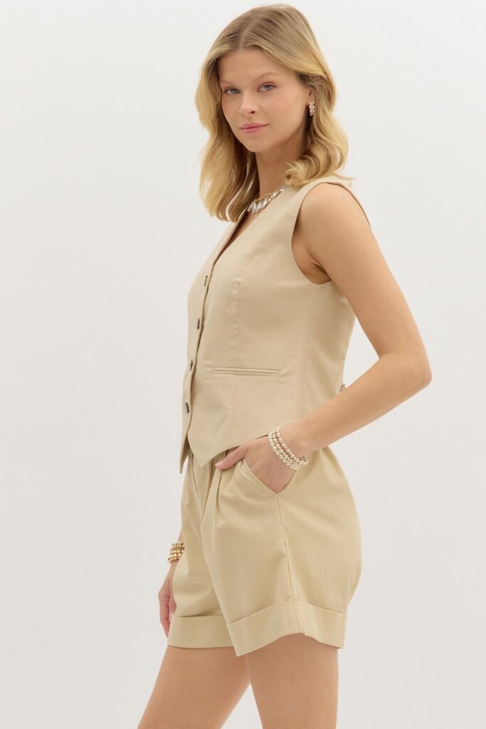 Chic and tailored, this beige vest and shorts set is perfect for a polished yet relaxed look. Featuring a button up vest with faux pockets and matching high waisted cuffed shorts, it's a timeless outfit for any occasion.