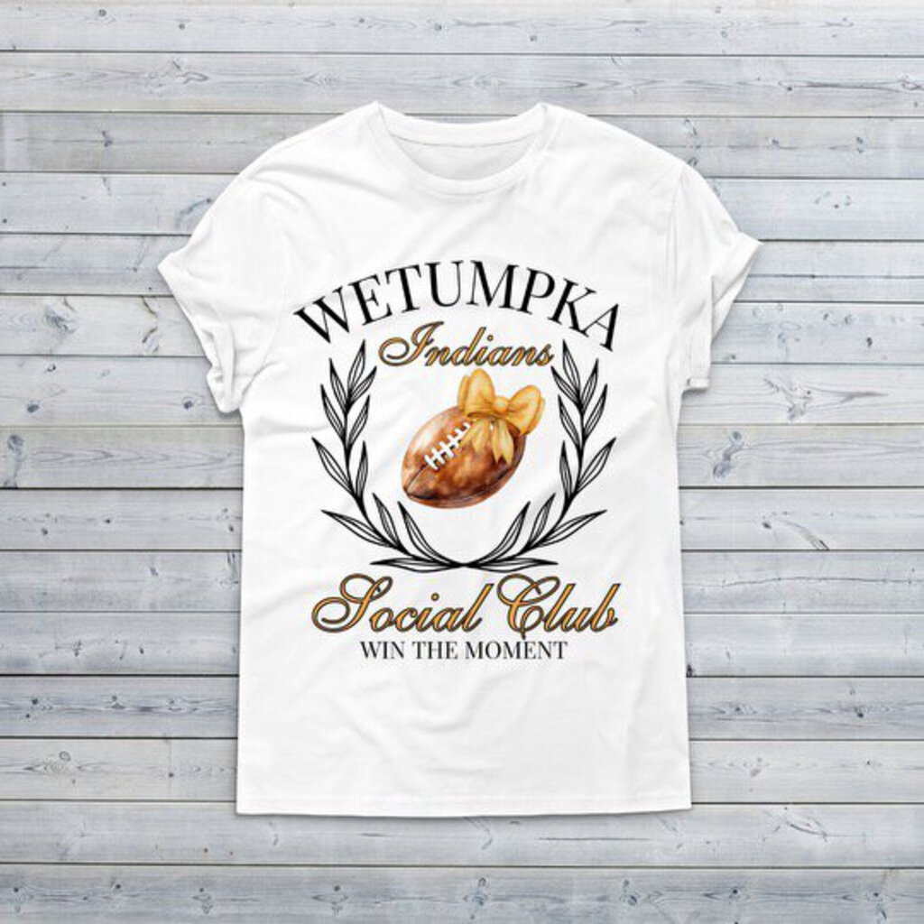 Custom designed and printed “Wetumpka Social Club” tee with football and bow design. Comes in regular and curvy sizes. Wetumpka Indians Football tee. Support Game Day for Wetumpka Alabama!