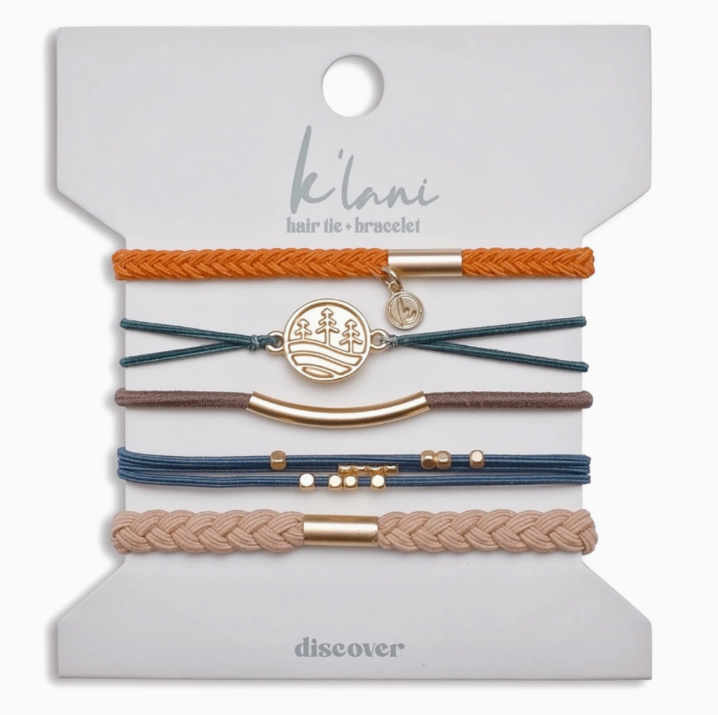 Our DISCOVER set includes five hair tie bracelets in bold jewel tones of orange, green, blue, and brown. The majestic pine trees on the gold charm will remind us to reach our full potential. Medium is the size of a normal hair tie band. It fits wrists between 5-6.4" around. Small is better for younger girls and small teens. It fits wrists under 5" around. Large is sized for wrists 6.5-7.5"