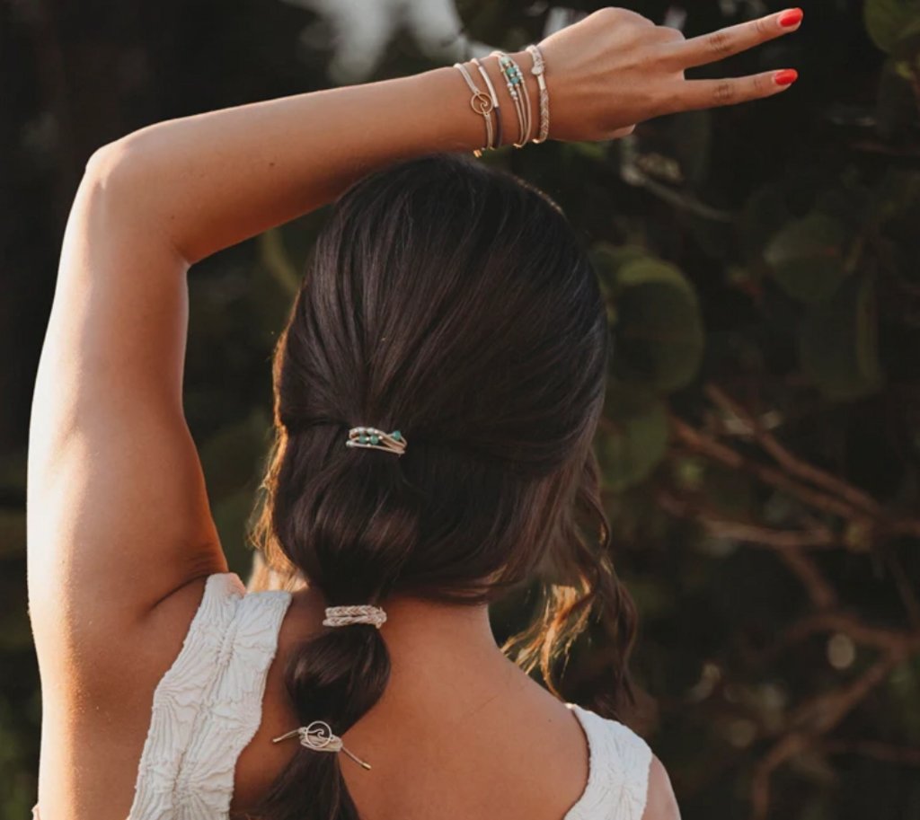 Our Explore set includes five bracelets that double as hair ties in the perfect earthy blend of tan, pink, gray and green. The gold charm is stamped with a compass to encourage all who wear it to keep exploring. Medium is the size of a normal hair tie band. It fits wrists between 5-6.4" around. Small is better for younger girls and small teens. It fits wrists under 5" around. Large is sized for wrists 6.5-7.5"