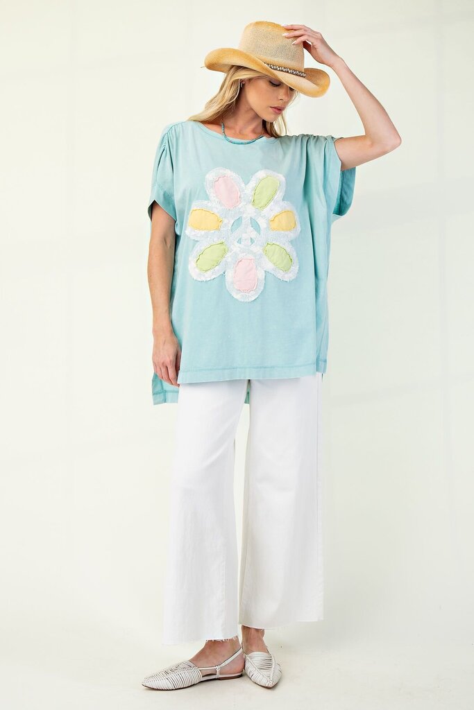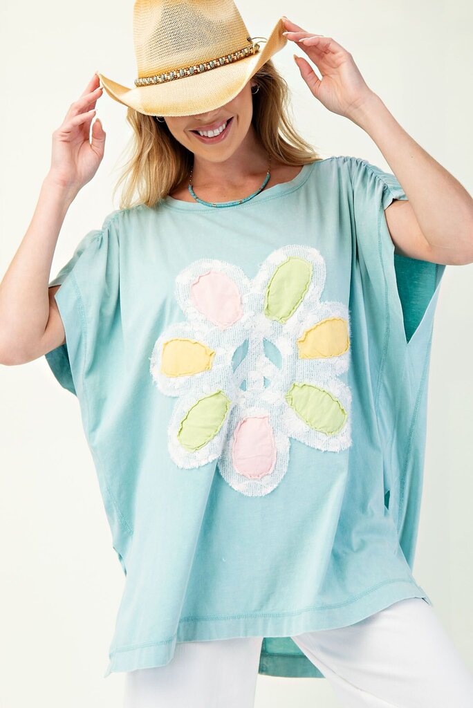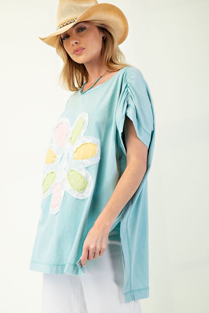 This beautiful baby blue top will make a great oversized top in spring and summer! The sleeves are bunched up for an extra stylish touch. The lace flower patch on front completes the look.