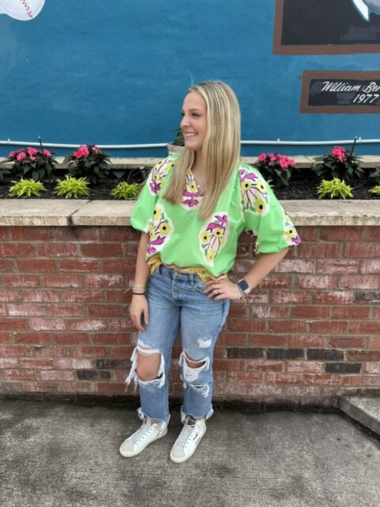 This top will add a op of color to your closet! The puff sleeves and yellow & green detailing will make this the perfect summer top!