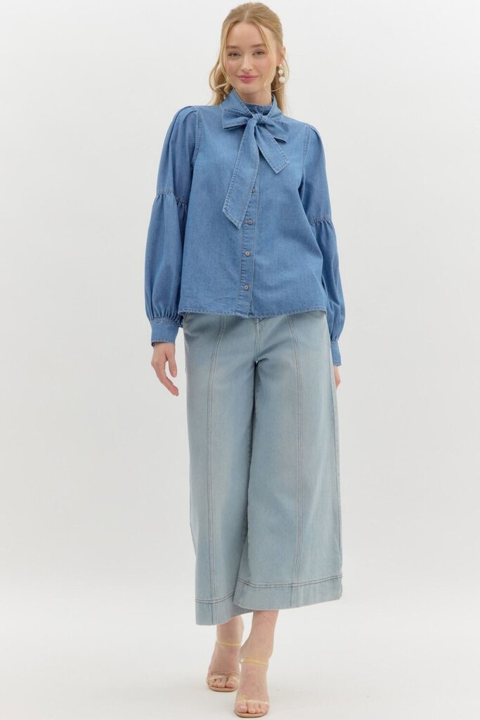 This adorable denim top is perfect for any cool summer night... it is a button up and had a tie that can be easily removed. Super cute and trendy!