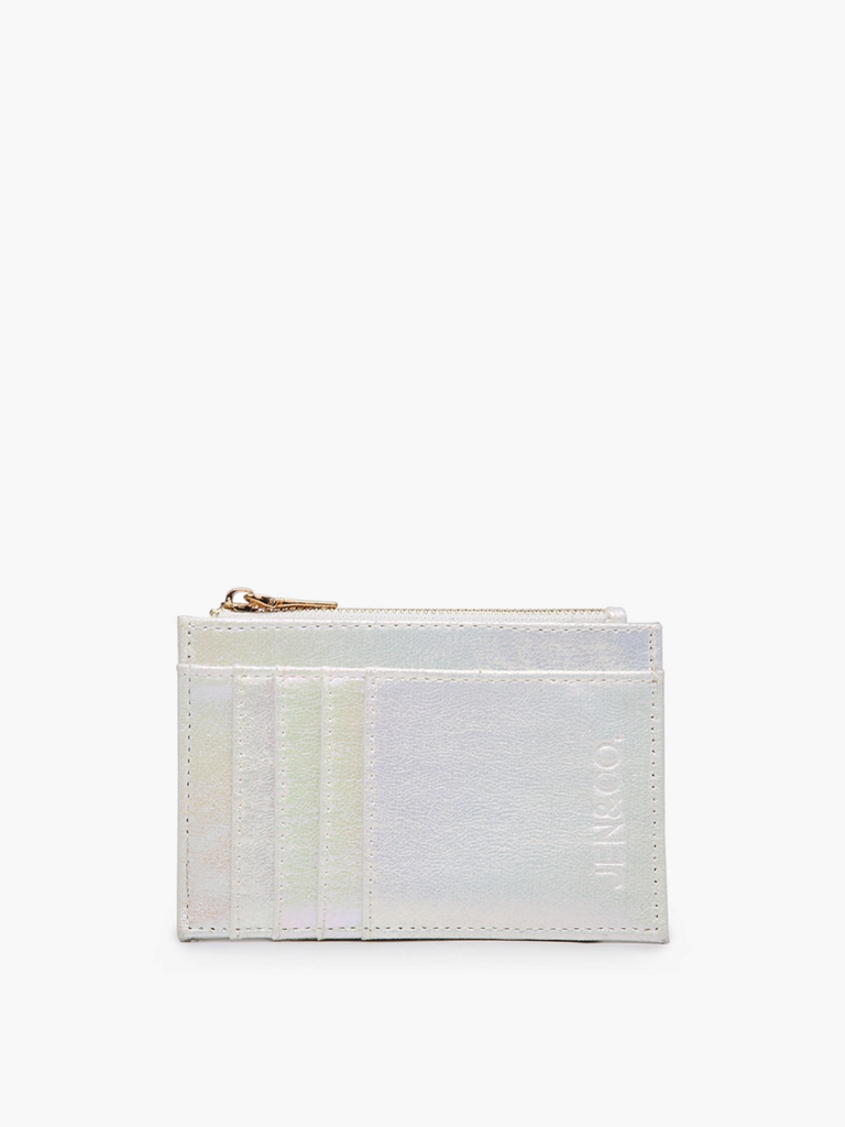 Sleek, compact, and functional- this RFID-protected wallet by Jen & Co is designed to for everyday ease and security. Crafted in a hologram pearl faux leather, it features multiple card slots, a clear ID window, and a secure zippered pocket for cash or coins. The minimalist design keeps everything organized without bulk, making it the perfect grab-and-go wallet for any bag or even your pocket.