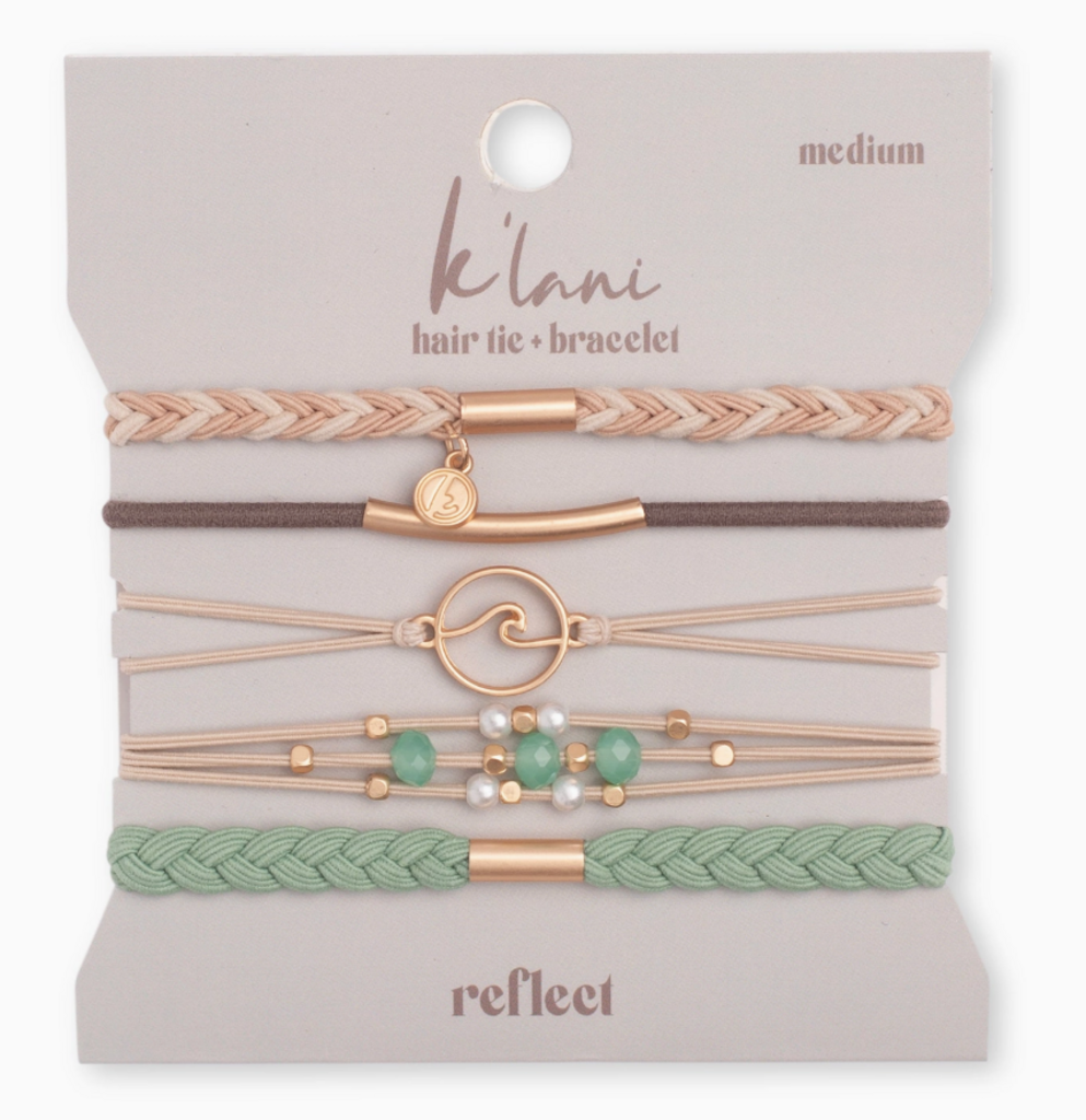 The Reflect set brings the peaceful energy of the beach to your style. These 5 hair tie bracelets are the perfect accessory made of earthy neutral and soothing green colors to remind you to calmly go with the flow as you reflect on what really matters. Medium is the size of a normal hair tie band. It fits wrists between 5-6.4" around. Small is better for younger girls and small teens. It fits wrists under 5" around. Large is sized for wrists 6.5-7.5"