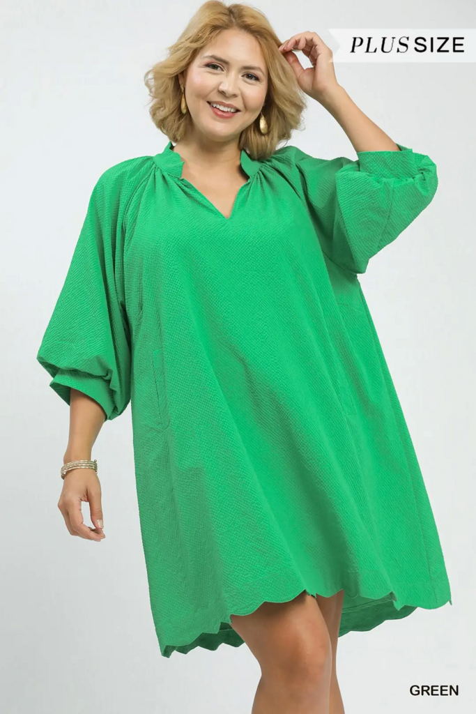 Textured Pocket Mini Dress...V-Neckline with soft Scalloped trim, 3/4 length balloon sleeves, side pockets, & lined! The most pretty spring dress!