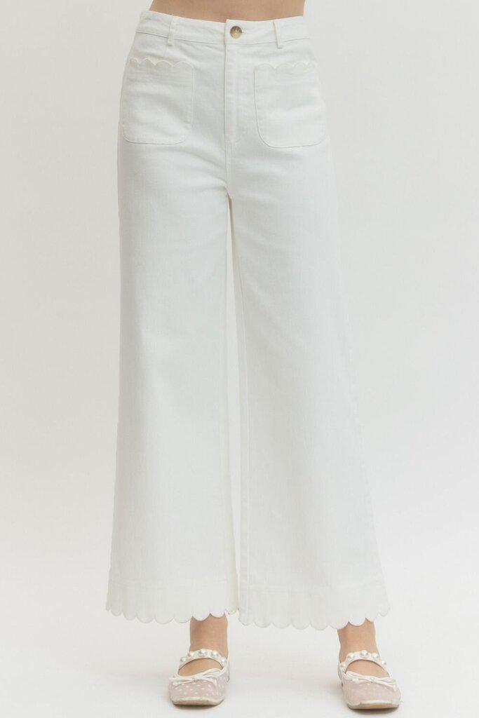 Solid White High Waist Wide Leg Pants featuring scallop trim at pockets & hem, front patch pockets, zip-fly button closure at front, woven, non-sheer, & lightweight.